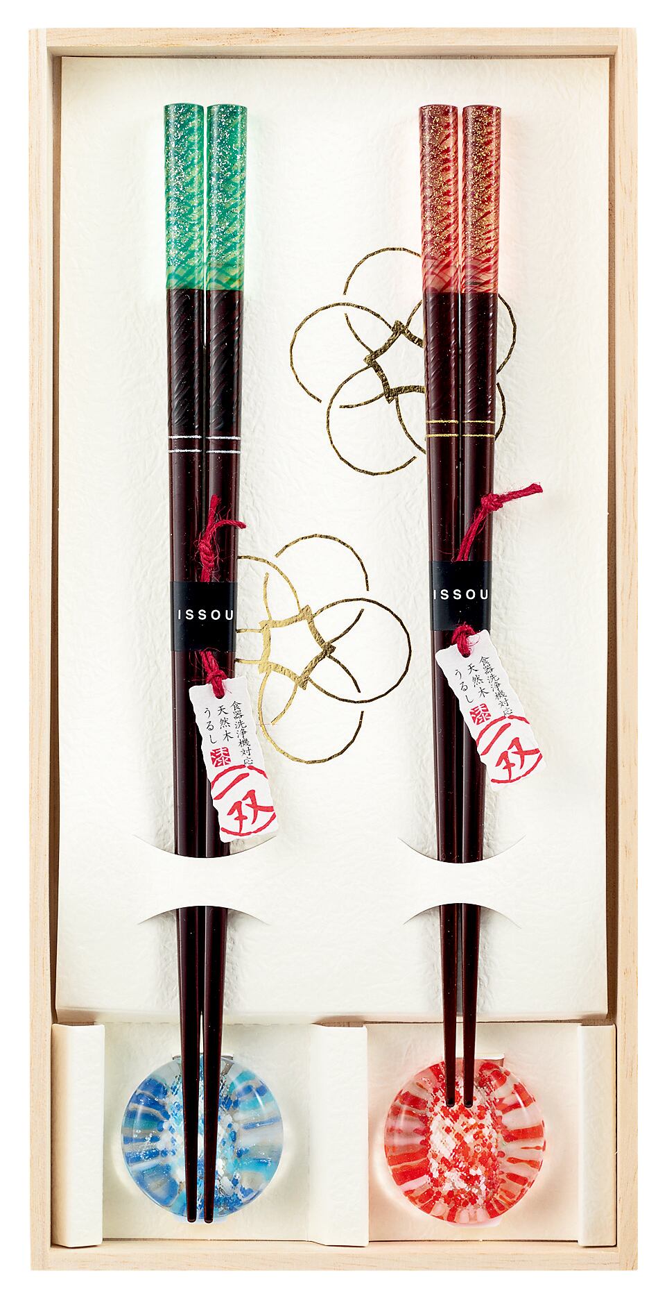 若狭塗(わかさぬり)は、福井県小浜市周辺で作られている漆器です。江戸時代初期に、若狭湾のそばに領地があった小浜藩の御用職人が、美しい海底の様子を図案化したものが起源とされています。若狭湾は、日本三景のひとつに数えられる天橋立(あまのはしだて)や、日本三大松原のひとつである気比松原(けひのまつばら)など、多くの景勝地がある風光明媚な場所です。若狭塗の特徴は、卵の殻や貝殻、マツの葉など模様をつくり、その上に漆を塗り重ねて研ぐ「研ぎ出し技法」を用いていることです。そのため、漆器の中でも独特な風格と重厚感をもっているので美術品として珍重されるほか、日用品としても普及し、若狭塗箸は日本国内で生産されている塗り箸の80〜90%を占めております。私たち日本人の食生活においてなくてはならない箸ですが、近年は世界中での和食ブームの影響や、海外から日本への観光客の影響もあり、塗り箸は日本国内のみならず、世界中で人気となっている商品です。また若狭塗の産地である福井県小浜市(オバマ市)は2008年に当時アメリカの大統領だったバラク・オバマ氏に対して「オバマ」という名前の縁から塗り箸を進呈したことからも有名になりました。こちらの商品は専用の桐箱に入っておりますので、大切な方への贈り物として、また特別な記念日の記念品としても最適です。海外では、インテリアとしてお部屋に飾って若狭塗箸の美しさを楽しまれる方も多いようです。●箸の素材:天然木 ●箸の材質:上部/アクリルウレタン 下部/漆 ●箸のサイズ:24cm&21.5cm ●箸置の材質:ガラス ●箸置きのサイズ:φ約3.5cm ●桐箱のサイズ:14.0×27.5×高さ2.3cm ■食器洗い乾燥機でお使いいただけます。※他の販売ルートと在庫を共有しておりますので、一時的に在庫切れとなる場合がございます。その場合、納期についてご相談させていただく場合がございますのであらかじめご了承ください。