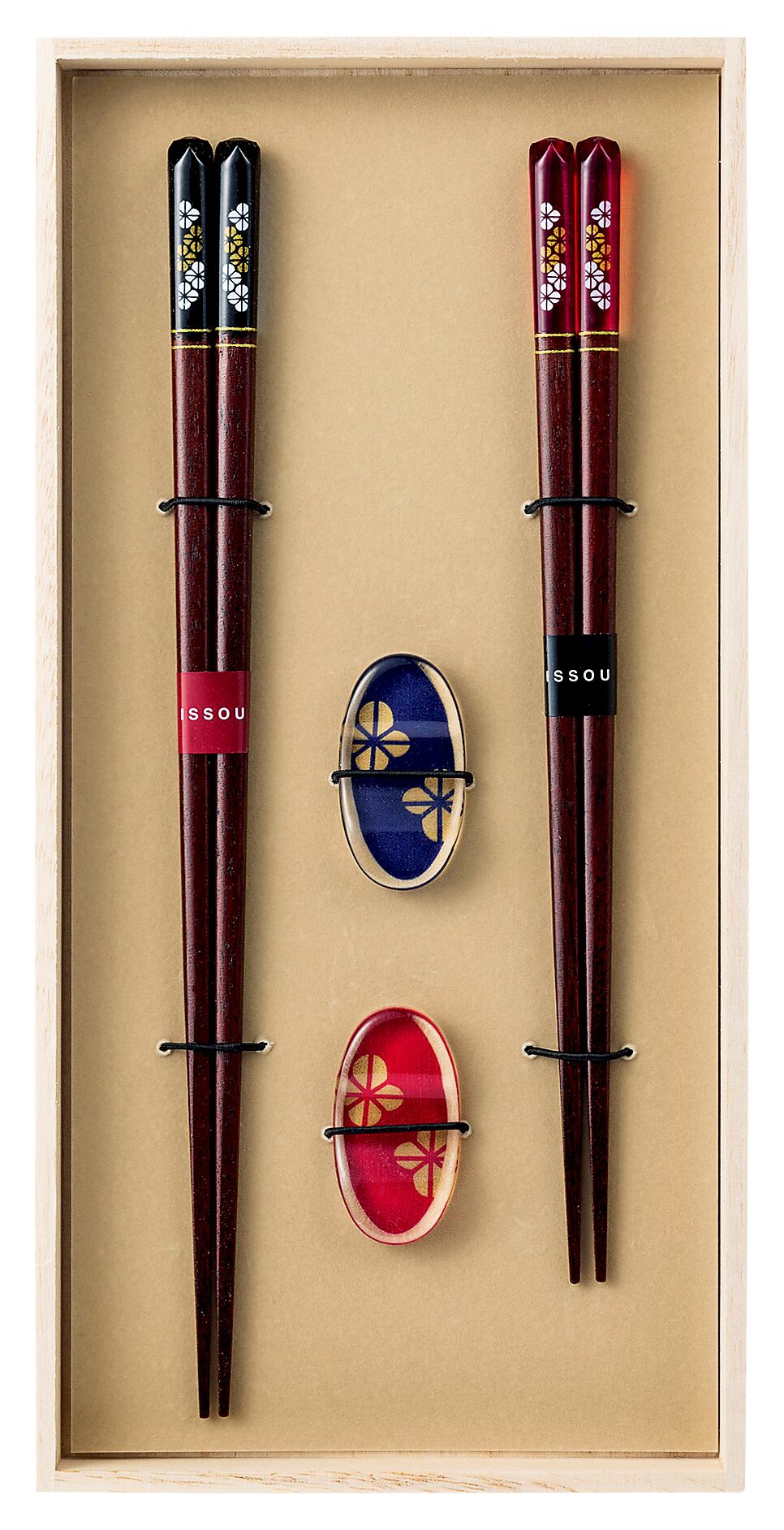 若狭塗(わかさぬり)は、福井県小浜市周辺で作られている漆器です。江戸時代初期に、若狭湾のそばに領地があった小浜藩の御用職人が、美しい海底の様子を図案化したものが起源とされています。若狭湾は、日本三景のひとつに数えられる天橋立(あまのはしだて)や、日本三大松原のひとつである気比松原(けひのまつばら)など、多くの景勝地がある風光明媚な場所です。若狭塗の特徴は、卵の殻や貝殻、マツの葉など模様をつくり、その上に漆を塗り重ねて研ぐ「研ぎ出し技法」を用いていることです。そのため、漆器の中でも独特な風格と重厚感をもっているので美術品として珍重されるほか、日用品としても普及し、若狭塗箸は日本国内で生産されている塗り箸の80〜90%を占めております。私たち日本人の食生活においてなくてはならない箸ですが、近年は世界中での和食ブームの影響や、海外から日本への観光客の影響もあり、塗り箸は日本国内のみならず、世界中で人気となっている商品です。また若狭塗の産地である福井県小浜市(オバマ市)は2008年に当時アメリカの大統領だったバラク・オバマ氏に対して「オバマ」という名前の縁から塗り箸を進呈したことからも有名になりました。こちらの商品は専用の桐箱に入っておりますので、大切な方への贈り物として、また特別な記念日の記念品としても最適です。海外では、インテリアとしてお部屋に飾って若狭塗箸の美しさを楽しまれる方も多いようです。●箸の素材:天然木 ●箸の材質:上部/ポリエステル 下部/漆 ●箸のサイズ:23.5cm&21cm ●箸置の材質:アクリル樹脂 底部ポリエステル塗装/耐熱温度100℃ ●箸置きのサイズ:約4.4×2.4cm ●桐箱のサイズ:14.0×27.5×高さ2.3cm ■食器洗い乾燥機でご使用はお控えください。。※他の販売ルートと在庫を共有しておりますので、一時的に在庫切れとなる場合がございます。その場合、納期についてご相談させていただく場合がございますのであらかじめご了承ください。